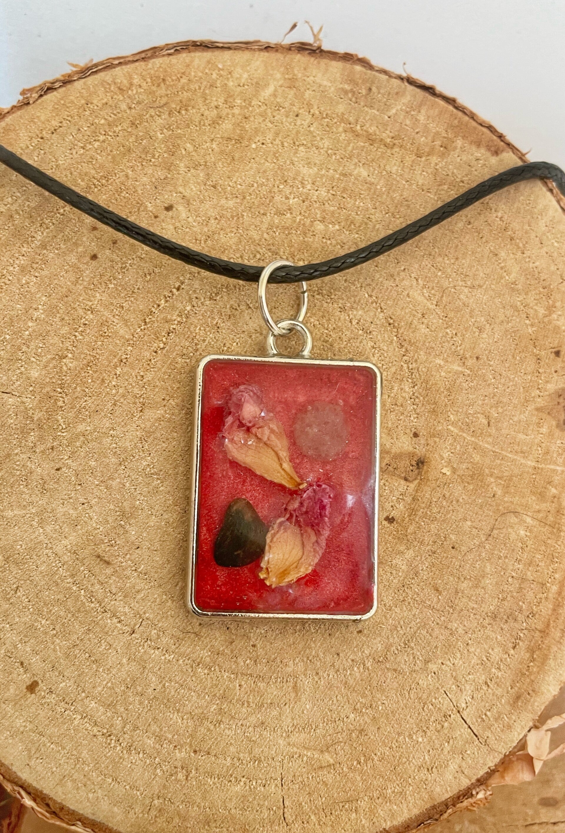 Chaque pendentif est une pièce unique, façonnée à la main en résine époxy, intégrant des pierres, des plantes et des couleurs spécifiques lien avec l'intention d'attirer l'amour.
